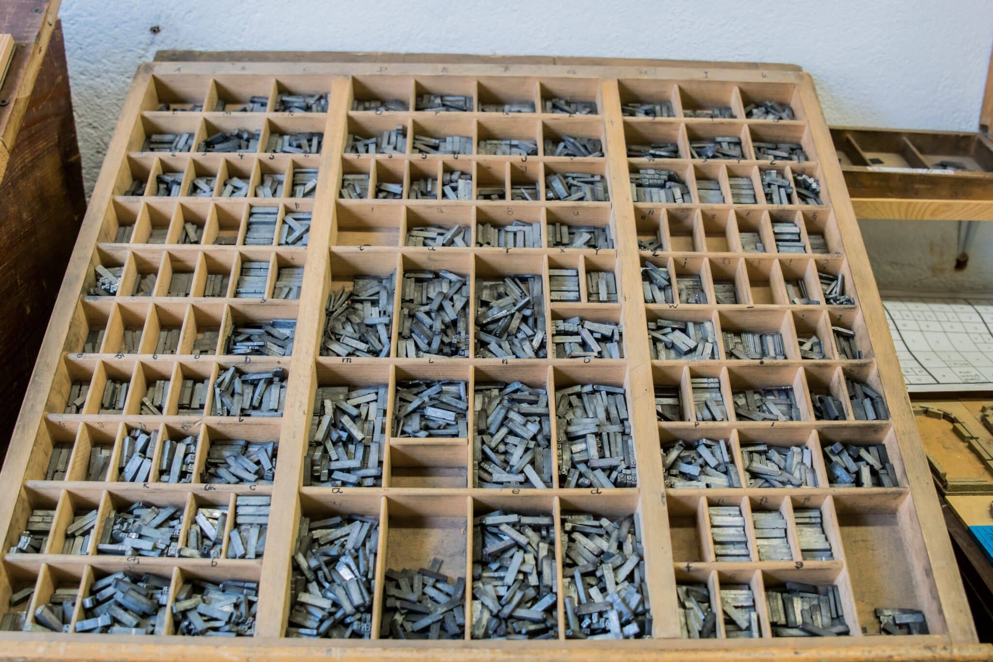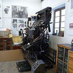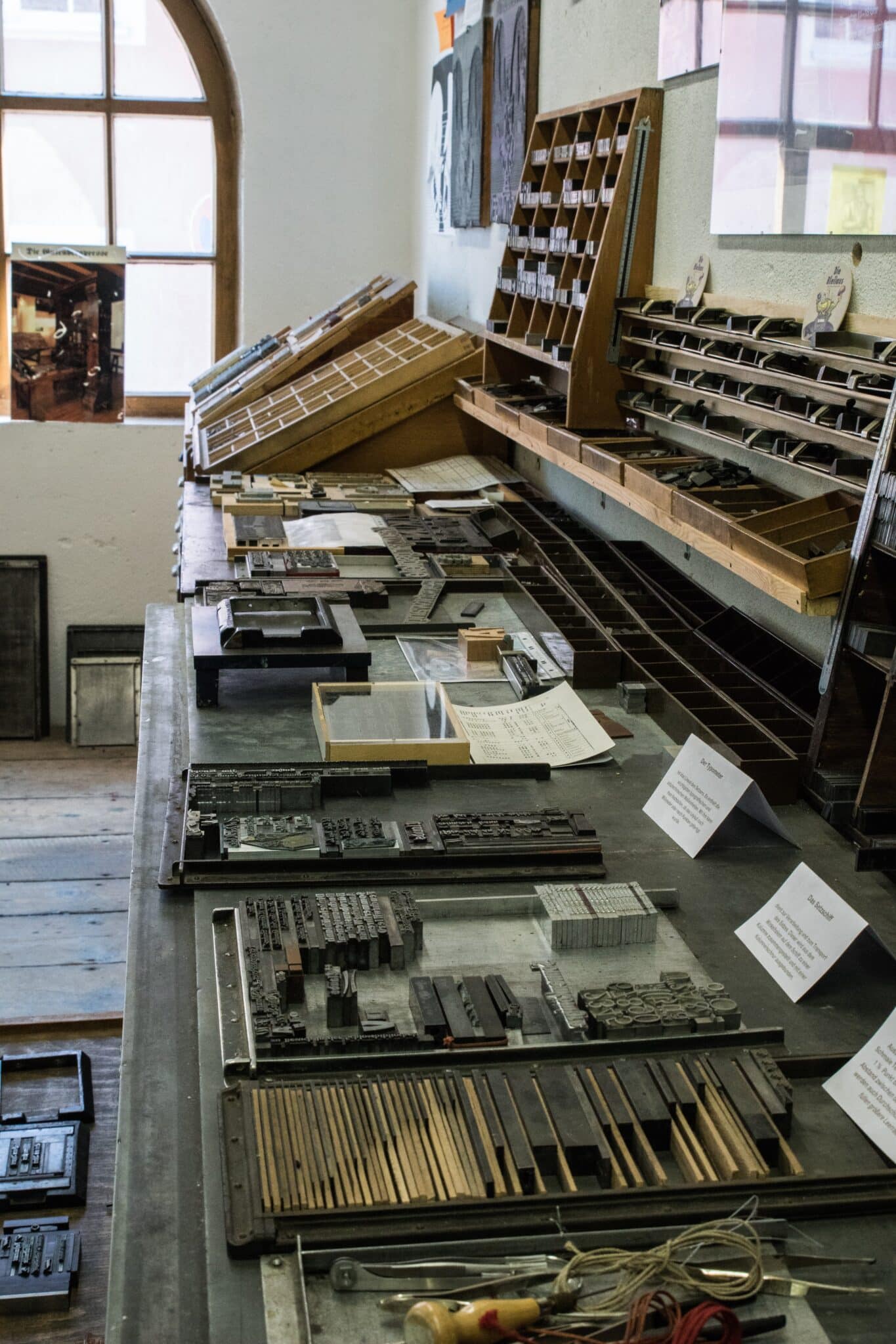 Was heute nach entschleunigter Handarbeit aussieht, war einst ein technologischer Quantensprung: das von Johannes Gutenberg entwickelte Prinzip des Drucks mit beweglichen Lettern. In der Druckerei lässt sich dieses Verfahren hautnah erleben. Vom Bleisatz über die Setzerei bis zum Druckvorgang auf historischen Pressen. Herzstück der Ausstellung ist die Handpresse von 1887, gebaut in der Maschinenfabrik Rockstroh & Schneider, flankiert von Setzkästen, Steckschriftkästen und dem Arbeitsplatz des Setzers, der sogenannten „halben Gasse“.